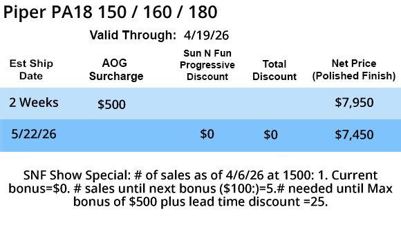 FMA/PMA Approved for the following models with 150, 160hp, and 180hp Engines. PA-18, PA-18S, PA-18 -105(Special), PA-18A, PA-18 “125” (Army L-2 1A), PA-18S “125”, PA-18 BAS “125”, PA-18″135″m (Army L-21B), PA-18 BA “135”, PA-18S -135, PA-18AS- 135, PA-18-150·1 PA-18A -150, PA-18S-150, PA-18AS -150, PA-19(Army L-18C) & PA-19S.
